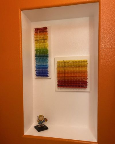 My woven glass sculptures consist of hundreds of glass ribbons that I create by hand-cutting large sheets of glass and adding details like stringers of colors and dichroic glass.